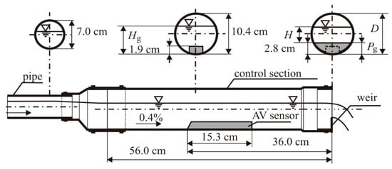 Control section with an area velocity ultrasonic flow meter (AV) sensor inside, where D is the pipe diameter, Pg is the outlet weir height, and Hg is the control section water level [].