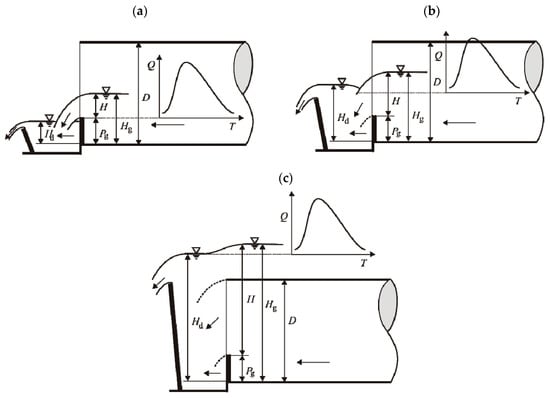 Unsubmerged weir and unpressured pipe (a); submerged weir and unpressured pipe (b); submerged weir and pressured pipe (c); Q is the discharge (dm3 s−1), T is time (s), H is the water level above the weir (mm), and Hd is the lower water level (mm).
