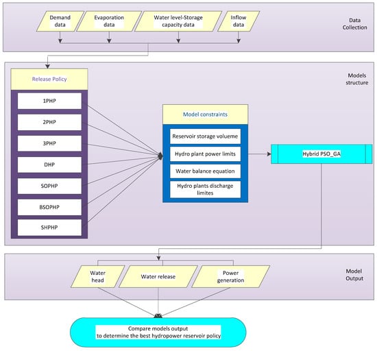The flowchart of the present work is summarized in Figure 1, which is comprised of four sections. Data collection includes demand data, evaporation data, water elevation-storage capacity, and daily inflow data. These data were used as input data of the models. The model structure is comprised of different forms of hedging policies based on the release rules, while all constraints are the same. The constructed models thereafter were linked to the hybrid PSO-GA algorithm. The outputs of models are daily water head, water release, and power generation. Afterwards, the results of constructed models were analyzed and compared to determine the best policy among the studied policies.