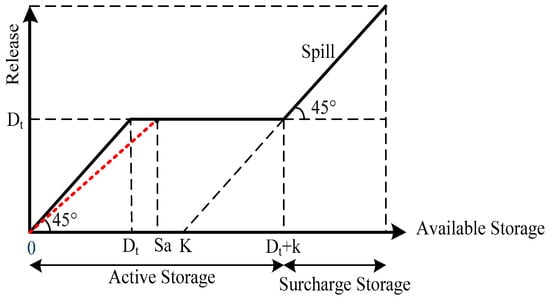 There is only one rationing stage in 1PHP (Figure 3), which the slope of this line (red line) is less than 45°. As a result, the amount of water release (Rt) will be less than the available storage (Wt) and release cannot fulfil the target demand (Dt). Sa represents the changing point on the target demand line specified as a decision variable for the 1PHP, which must be simulated or optimized. Moreover, when the amount of available storage touches Sa in 1PHP, the water release could fulfil the target demand until the available storage equals the target demand plus the reservoir capacity. The last stage of hedging policies is the same. If the available storage surpasses the summation of target demand (Dt) and active storage (K), spill (SPt) will occur []. For more information about the formulation of this policy, refer to Table S1 (1PHP).