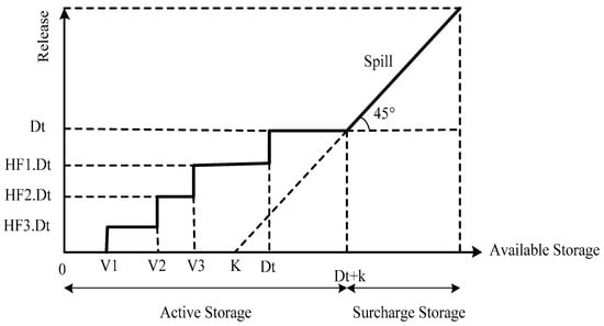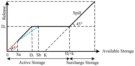 There are two rationing stages in 2PHP, which the rationing lines are smoother than the 1PHP. It means in a case of same available storage, if we compare the 1PHP with 2PHP policy, the amount of release in 2PHP is higher than 1PHP and less water will be saved for the future. The parameters Sa and Sb indicate reservoir storage at the first and second changing points respectively. These two parameters afterwards should be optimized to form the 2PHP for the specific reservoir. Whenever the available storage exceeds Sb, the water release could satisfy the target demand until the available storage goes beyond the sum of Dt + K and the spill occurs (Figure 4). The rest of the parameters were introduced earlier. For more information about the formulation of this policy, refer to Table S1 (2PHP) [].