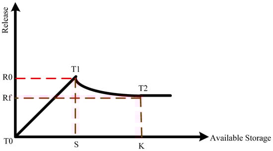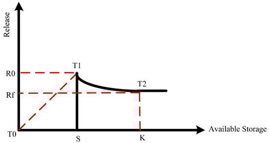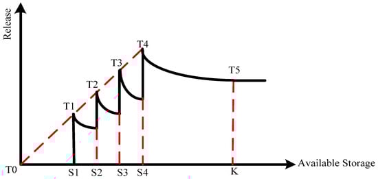 Using more than one turbine is ordinary in a hydropower reservoir system []. When available-storage is not adequate to produce target power, it is economical to utilize fewer turbines with full discharge load rather than partial discharge in all turbines. Assume that there is a hydropower reservoir system with four turbines with the same power capacity. Therefore, each turbine can only produce 25% of full capacity. The form of standard hedging policy for hydropower production (SHPHP) indicates in Figure 9. To clarify more, S1 is the quantity of available-water to produce 25% of the full capacity and S2 is equal the amount of water to produce 50% of the full capacity. If WAt < S1, no turbine is running for operation and output of power is zero. If the available water is between S1 and S2, only one turbine can be employed in generation, which means the power production is 25% of full capacity. Whenever S1 < WAt < S2, the amount of release to produce (1/4) full capacity will decrease as the head increases. Meanwhile, the release rule has a curve from. A similar strategy is applied for S3 and S4. S3 and S4 are the quantity of available water to produce 75% and 100% of the full capacity respectively. If S2 < WAt < S3, two turbines utilize, which means the power production is equal to half full capacity. If the S3 < WAt <S 4, three turbines use for the operation to produce 75% of full capacity. If the WAt ≥ S4, four turbines are operated to produce 100% full capacity. Furthermore, beyond full reservoir capacity (K), the head is constant. Therefore, the release is only a function of available water and the line beyond T5 is a constant line. It is worth noting that the slope of the line which connecting T0, T1, T2, T3, and T4 is 45°. Moreover, the number of decision variables or optimization parameters in this policy depend on the number of turbines. In the above example, the system has four turbines. Therefore, four parameters—including S1, S2, S3, and S4—should be simulated or optimized. The formulations of water release are expanded in Table S1 (SHPHP).