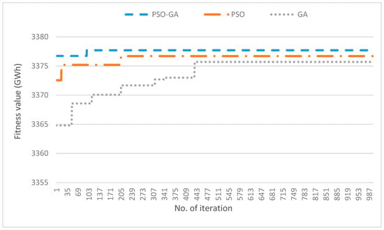 In order to choose the best algorithm among PSO, GA, and hybrid PSO-GA, the algorithms were linked to one of the constructed model (1PHP), in order to find the most effective optimization technique. Results of comparison showed that the hybrid PSO-GA can simultaneously find the promising solution and speeding up the convergence (Figure 11). Based on the given results, the hybrid PSO-GA algorithm found the highest fitness value in a lower number of iterations, which demonstrated the superiority of the hybrid optimization algorithm compared with PSO or GA. Based on this, the proposed algorithm (PSO-GA) was used in this research to optimize other constructed hedging policies