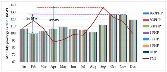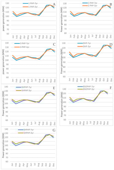 Whenever the optimal points in each model were found, the optimized hedging policies should be validated. Accordingly, the measured monthly mean power generation (MW) using data from 2003–2009 (period used for model construction) were compared with the predicted monthly mean power generation (MW) using the data from 2010–2012 and the comparisons are shown in Figure 12. The comparisons were made with seven models namely, 1PHP, 2PHP, 3PHP, DHP, SOPHP, BSOPHP, SHPHP and selected results are demonstrated in Figure 12. Also, model tests showed that there is no significant difference between the predicted and measured monthly mean power generations.