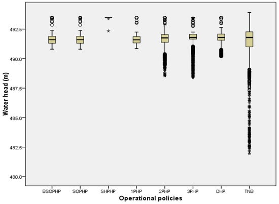 As mentioned earlier, in operation of a reservoir for hydropower generation, two parameters effect on power production output, including water release and water head. When storage in the reservoir is more, the head is also more. Hence, a smaller discharge from a reservoir may be sufficient to produce the required power. Thus, water level makes a significant role in power generation output. The highest water level has more benefit in power production. Therefore, statistical analysis of reservoir elevation for developed operation policies is done and summarized by using box plot of reservoir elevation (Figure 14). The vertical lines demonstrate the variation of reservoir head, and the second horizontal lines (Q2) represent the mean water level in the reservoir by using each policy. The skeletal box plot consists of a box extending from the first quartile (Q1) to the third quartile (Q3). The schematic box plot divides the data based on four invisible boundaries namely, two inner fences and two outer fences. As a common, we define the interquartile range (IQR) to be Q3 − Q1. The inner fences are Q1 − 1.5 IQR and Q3 + 1.5 IQR, while the outer fences are Q1 − 3 IQR and Q3 + 3 IQR. Outliers are usually plotted as individual points, which the ‘o’ symbol represents the inner outlier and ‘*’ represents the outer fences.