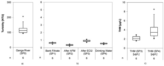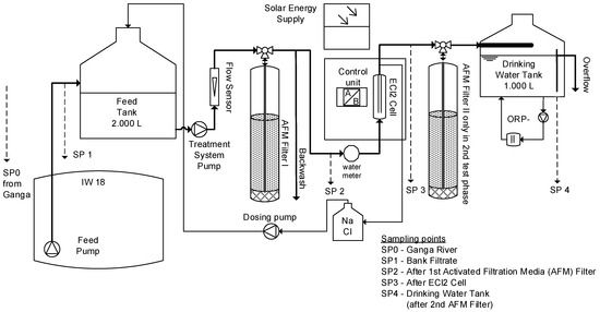 For water quality analysis, random samples were taken one to two times per week at five sampling points (SP0 Ganga River, SP1 bank filtrate, SP2 after AFM filtration, SP3 directly after inline electrolysis, SP4 in final drinking water storage water tank) (Figure 2). Electric conductivity (Hach CDC 101), dissolved oxygen (LDO 101), and pH (Hach PHC 101) were measured with a Hach Multimeter HQ40d (Düsseldorf, Germany). The ORP in SP1 (bank filtrate) and SP4 (drinking water) was measured directly with the pilot system using a Jumo tecLine Rd electrode (Fulda, Germany). For parameters shown in Table 2, an Aqualytic AL410 (Dortmund, Germany) handheld photometer was used. Analysis of immediate parameters and parameters in Table 2 were done on site.