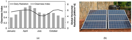 Clearness indices and monthly global horizontal radiation values (a); and the installed solar system (b).