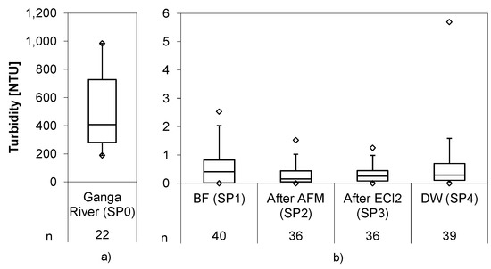 Turbidity in the Ganga River averaged to 501 ± 243 NTU and was reduced to 0.55 ± 0.63 NTU in the bank filtrate (Figure 4), underlining the role of bank filtration as a barrier for particle ingress. The AFM filter further reduced the turbidity down to 0.30 ± 0.34 NTU, and by that substantially improved water quality prior to the chlorination. This value could be nearly maintained during the passage in the electrolysis cell but increased to 0.70 ± 1.16 NTU with outliers and 0.40 ± 0.38 NTU without outliers, which were caused by filter-breakthrough. The slight but constant increase of turbidity was traced back to calcareous deposits released from the electrolytic cell after polarity inversion. In the second short term trial, a second media filter was installed to remove those deposits.