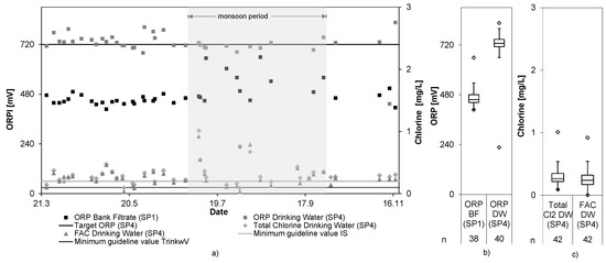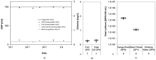 ORP of bank filtrate (SP1), ECl2 effluent (SP4), and chlorine (FAC and total) in ECl2 effluent (SP4) (a–c).