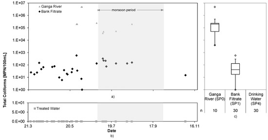 Total coliforms in the Ganga River water and bank filtrate (a) and drinking water (b), and statistical interpretation (c); trial period March–November.
