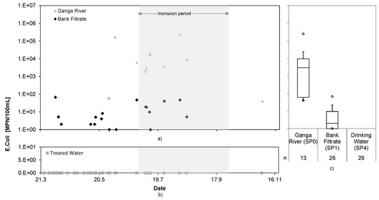 E. coli in the Ganga River water and bank filtrate (a) and drinking water (b), and statistical interpretation (c); trial period March–November.
