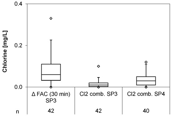 During the trial period the chlorine demand (ΔFAC) was very low, with 0.03 ± 0.03 mg/L on average, but peaked to 0.33 mg/L. Combined chlorine, formed directly at SP3 and SP4, were 0.09 ± 0.08 mg/L and 0.02 ± 0.02 mg/L, respectively (Figure 8).