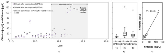 Chloride and chlorate concentrations during field test (a,b), and their correlation (c).
