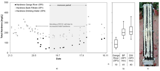 The hardness values were fluctuating throughout the test period in the Ganga River (92 ± 39 mg/L) and the bank filtrate (207 ± 40 mg/L). Whereas the values in the bank filtrate ranged around an unproblematic 200 mg/L during monsoon, the levels reached ~300 mg/L before and after the monsoon season. Those values have shown to be problematic for system operation, as spontaneous growth of calcareous deposits on the ECl2 cell intermittently reduced chlorine production efficiency and required extra maintenance.