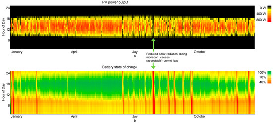 The simulation shows, that with the installed solar PV-battery combination of 900 Wp and 2 × 96 Ah, the required electricity can be supplied nearly throught the year. Only a few hours of electrictiy shortages including a 7-h long power cut in the middle of the monsoon in August occured. The total capacity shorage summed up to 0.4%. Whether this is permissible in a real case scenario and whether this could be compensated by, for example, an increase of the water storage capacity depends on local conditions. The simulated power production and SoC is shown in Figure 14a,b, respectively.