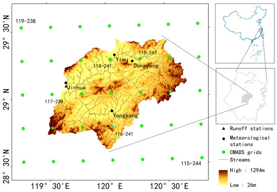 Location, elevation, hydrometeorological stations, and CMADS grids in Jinhua River basin.