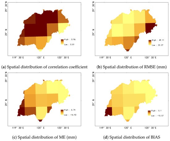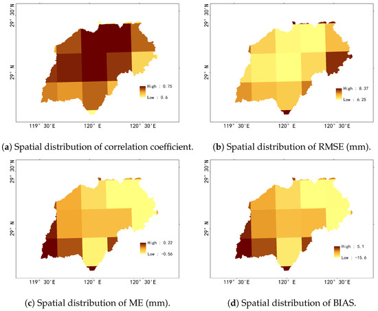The spatial variabilities of CC, RMSE, ME, and BIAS of monthly precipitation within Jinhua River basin are similar with that of daily precipitation (Figure 5). The result shows that CMADS estimates monthly precipitation better in plain areas than in mountainous areas. The correlation coefficient ranges from 0.81 to 0.96, with larger values in middle plain areas and smaller values in marginal mountainous areas. The spatial distributions of ME and BIAS of monthly precipitation show that CMADS tend to underestimate precipitation in most parts of the basin except some marginal mountainous areas.