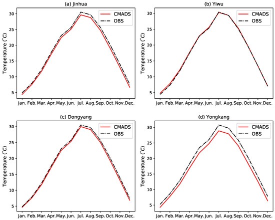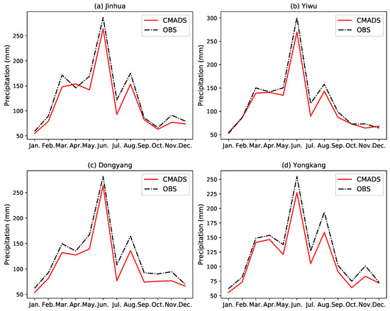 Precipitation and Temperature are the most important meteorological factors for hydrological simulations. The comparisons of temporal distribution patterns of multi-year average monthly precipitation, temperature are shown in Figure 3 and Figure 4. The results show that CMADS can capture temporal distribution patterns well for precipitation and temperature. Overall, CMADS almost underestimates these evaluated meteorological elements more or less for all months in the evaluated gauges. The exception is that the temperature estimates of Yiwu station are consistent very well with gauge observations for every month in a year.