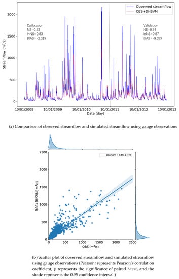 The performance of DHSVM for streamflow simulation using gauge meteorological data as inputs in Jinhua River basin during calibration and validation has been shown in Table 4. The NS efficiency coefficients are 0.73 and 0.74 during calibration and validation period, respectively, indicating that the model can capture the streamflow characteristics well. The model performs well in low flow simulation, with 0.83 and 0.87 for lnNS during calibration and validation period, respectively. The BIASs are <5% for calibration period (%) and <10% for validation period (%), which means that the model performs well in streamflow volume simulation.