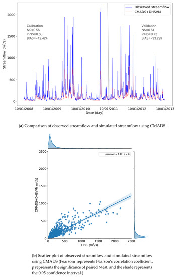 The hydrological application performance of CMADS is shown in Table 6. Overall, the model using meteorological data derived from CMADS can capture the streamflow characteristics acceptably, with the NS of 0.56 and 0.61 for calibration period and validation period, respectively. However, the model underestimates streamflow significantly, with the BIAS of % for calibration period and % for validation period. It can be seen from Table 7 that the underestimation of low flows (during dry seasons) is more serious than high flows (during wet seasons) during calibration period. The underestimation of low flows and high flows are similar during validation period.