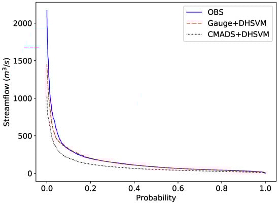 Flow duration curve is of significant importance in flood controlling and water resources management. Figure 8 compares the flow duration curves of observed, simulated with gauge observations, and simulated with CMADS data runoff. The result show that the majority of daily flows (>90%) are less than 500 m/s. The flow duration curves of observed runoff and simulated runoff with gauge observations have a similar probability distribution pattern while the simulated flow with CMADS underestimates runoff at almost all quantiles.