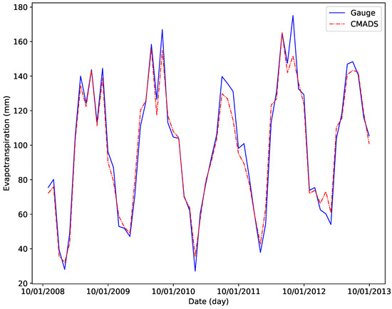 Actual evapotranspiration is one of the most important components of water circulation. It links energy exchange and mass (such as water and carbon) transport. In this paper, the evaluation of CMADS in simulating evapotranspiration is performed using compared simulated evapotranspiration forced by CMADS with that forced by gauge observations. The deviation between simulated evapotranspiration forced by CMADS and actual evapotranspiration needs to be further investigated.