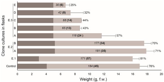 The percentage growth relative to the total weight of the controls in the bioreactors varied between 37% and 39.4% (mean = 39%; n = 4). A slightly higher growth than in the controls was only achieved in treatment B in E.4. (i.e., culture temperature, 20 °C). Growth was lower in the other experiments and was up to 4 times lower in the experiment simulating spring conditions (E.5).