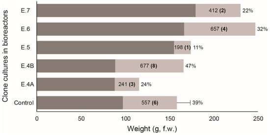 Axenic cultures of a clone of the aquatic moss F. antipyretica were successfully maintained. The growth rates were 3 times greater in the bioreactors than in flasks after culture for 4 months, although the growth rate relative to the initial weight was 7 times higher in the flasks (see Figure 1 and Figure 2). Despite the high rate of growth of the clone, the increase in biomass was lower than reported for other bryophytes (e.g., Sphagnum palustre) in which much greater increases in biomass were achieved in only 4 weeks []. In order to resolve this problem, we attempted to maximize the in vitro growth of the clone by modifying both the culture medium and the different culture conditions.