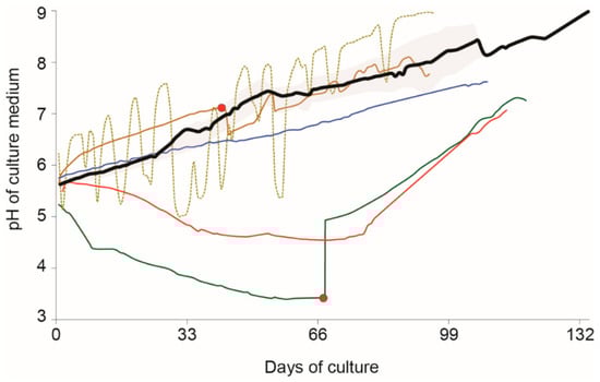 Evolution in pH of the culture medium of the moss clone Fontinalis antipyretica for the different experiments carried out in bioreactors (E.4–E.7, see text for more details) and recorded by the bioreactor software. Black line and gray shading: mean and interval in controls; blue line: E.4 A; red line: E.4 B; brown line: E.5; green dashed line: E.6 and green line: E.7. Reds points are shown for E.5 and E.7 when the culture conditions were changed.