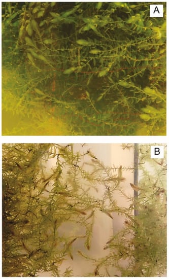 Appearance of the moss clone Fontinalis antipyretica cultivated in bioreactors: (A) in the control culture medium and (B) physiological deterioration observed after the addition of NH4NO3 in the experiment 7.