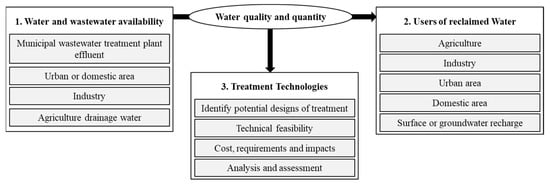 The presented research focuses on the pre-feasibility stage and considers potential water reuse schemes in a systemic approach schematically (Figure 1). This allows determining if an identified area with potential for water reuse could lead to a feasible reclamation scheme with the current resources, technologies, and available information.