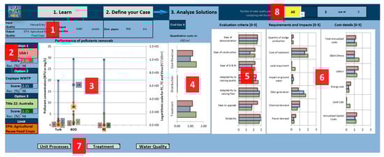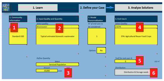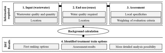 There are several decision support tools (DSTs) available for water and wastewater treatment selection and design that have been reviewed by Hamouna et al. [3] (Table 1). Most DSTs usually address planners and designers with a strong focus on technical aspects, usually dominating the logic of the developed systems reviewed [3]. Hamouna et al. [3] also mention that there is a need for integrated decision support tools that are generic, usable, and that consider a system analysis approach. The present paper aims to address this need for a user friendly and comprehensive interface with solid background calculations. A broad range of stakeholders can then apply the DST to facilitate the implementation of water reuse solutions, by applying a multi-criteria assessment. The DST differs from existing tools by proposing a different scope of application, rather than a comprehensive technical design. The different scope consists of the pre-feasibility, capacity building, and promoting the concept of water reuse. The DST’s underlying data and pre-selected information are open access and transparent.