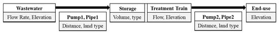 For comparable and easily understandable results, the distribution costs were also calculated in costs per m3 of reclaimed water based on the annual lifecycle costs. The calculation of the total annual distribution of lifecycle costs allows the consideration of one transport pipe from the wastewater source to the treatment scheme, a storage tank, and another transport pipe to the end-use location (Figure 3). The detailed calculation procedure for the different distribution cost components are depicted in Appendix A and requires the different elevations, the flow rate, and the volume for the storage tank. Equation (5) is applied for the calculation of the annualized distribution costs per m3 of reclaimed water.