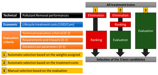 The calculation of an overall assessment score for different treatment trains was determined by Equation (6). The user can assign different weights Wi to different assessment criteria depending on the local situation. For the calculation of the overall assessment score, all criteria were recalculated to a range between 0 and 1 and the semi-quantitative indicators were normalized. The criteria defined in Table 9 between 0 and 3 were divided by 3, and the semi-quantitative criteria divided by the highest value of the list of treatment trains considered in the DST. For the requirement, impact, and cost (RIC) criteria, for which a higher score was a negative characteristic, the formula 1 − RIC/3 was applied to obtain a final overall assessment score (high score is positive).