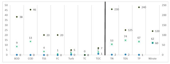 Water quality can be defined by an almost indefinite number of parameters: the topic is immense and the purpose of many books [29,30,31]. The concentration of any substance or constituent potentially present in wastewater could be a parameter to be analyzed, in addition to all physical, chemical, and biological parameters that can be measured. This requires a selection of the most relevant parameters based on the relevance of several parameters, namely, different intended reuse, data availability of removal performance of the different technologies, and the technology’s inclusion in most prominent guidelines for quality standards, recommendations by water reuse experts, as well as the ease to measure and monitor the parameters. After several organized workshops with experts in the field of water reuse [32], 12 key water quality parameters were considered as most appropriate for the identification and initial assessment of the potential of water reuse options, and were integrated in the DST (Table 4). Future versions of the tool might address more specific types of contaminants, such as microplastics, organic contaminants, emerging pollutants, or specific pollutants of industrial wastewater (e.g., dyes and bleach from textile industry, fungicides and pesticides from agricultural food processing)