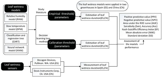 The models tested here were aimed at estimating leaf wetness duration. Four leaf wetness models were applied to data collected in a plastic greenhouse of Almeria, Spain and in a solar greenhouse placed in Beijing, China. The tested models were: a simple relative humidity threshold (RHM), a dew temperature-based model (DPM), a classification and regression tree (CART) and a model based on a neural network (NNM). The choice of using weather and leaf wetness data coming from Spanish and Chinese greenhouses was driven by data availability. The relevance of our procedure is its ease of replicability in different greenhouse conditions, more than in different geographical areas. The classification tree function in MATLAB R2018a was used to calibrate the parameters of the leaf wetness models, and their performances were assessed by the statistical indexes: positive predictive value (PPV), negative predictive value (NPV), area under the receiver operating characteristic curve (AUC) and Nash–Sutcliffe efficiency index (EF), and mean absolute error (MAE) and standard deviation (SD). The workflow is shown in Figure 1.