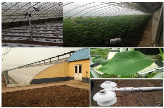 Two greenhouses located in Spain (Figure 2) and China (Figure 3) were used in this study to evaluate the LWD models’ accuracy. In Spain, the greenhouse size was 877 m2 (37.8 m × 23.2 m) with a variable height (between 2.8 m and 4.4 m) and a polyethylene cover, whitened to reduce radiation (by the application of a CaCO3 suspension) based on the external conditions. The tomato crop density was 2.01 plants/m2 (6 plants per slab, 1.9 m between slab rows and 0.5 m between slabs in the same row). Two electronic sensors were designed to mimic the size of natural leaves based on obtaining a dielectric constant on the sensor surfaces using a capacitive grid (Decagon Devices, Pullman, WA, USA), and they were installed at the bottom and top of the canopy in the center of the greenhouse at a 30° angle. There was a weather station inside the greenhouse to test the air temperature and air humidity (Vaisala HMP45P, Helsinki, Finland), which was located at the center of the greenhouse at a 2.0 m height. The leaf wetness data were collected from 2016 to 2018. In China, the greenhouse size was 210 m2 (30 m × 7 m) and was constructed of metal arches covered with polyethylene film. A total of 504 cucumber plants were arranged in a double-row pattern with small 40 cm spaces and large 1.1 m spaces between rows; there was also a space of 0.4 m between plants in each row. The air temperature and relative humidity in the greenhouse were recorded every 15 min by sensors coupled to a data logger, which was located at the center of the greenhouse at a 1.5 m height. The data were transferred from the data logger (an RS485 connection) to a central computer (an RS232 connection) via a local area network (LAN) and stored in a Microsoft Access 2003 database. Five leaf wetness sensors (#6420, Davis Instruments Corp, Hayward CA, USA) and a data logger (CR1000, Campbell Scientific, Logan, UT, USA) were located at the leaf apex, the left and right side of the leaf, the underside of the leaf and 0.05 m below of the leaf, and were always kept at the middle of the canopy during crop growing [28]. The data were acquired from 2014 to 2015.