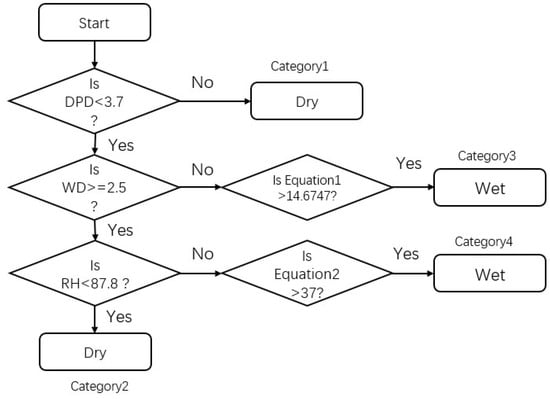 - The CART model [33] has four category conditions to identify whether leaves are dry or wet (Figure 4); these are the hours considered dry if either the hourly different value (DPD) is equal or greater than 3.7 °C (category 1) or if the relative humidity (RH) is less than 87.8% and the hourly wind speed (WD) is equal or greater than 2.5 m s−1 (category 2). The hours in category 3 (Equation (1)) and category 4 (Equation (2)) are classified as either dry or wet by a subsequent stepwise linear discriminant analysis.