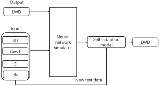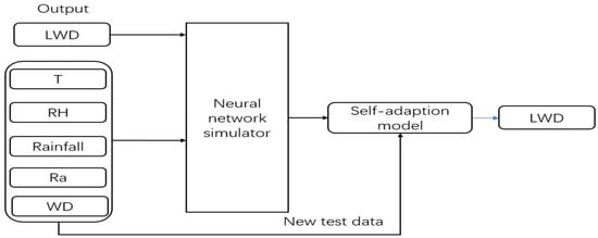 - A neural network model (NNM) is a method to predict a set of outputs from a set of input patterns [34]. It is like a central nervous system that can learn tasks by considering examples. Leaf wetness is the output of a neural network-based leaf wetness model [14]. Francl et al. estimated wheat leaf wetness using the inputs of temperature, relative humidity, solar radiation, precipitation, wind direction, and wind speed [24]. Marta et al. carried out the model in 47 weather stations, and its input parameters were rainfall, vapor pressure deficit, wind speed and solar global radiation [29]. Stella et al. [25] used the inputs (temperature, relative humidity, rainfall, wind speed and solar radiation) in a neural network model for estimating apple leaf wetness. We chose the empirical input parameters of NNM that are shown in Figure 5, in which T is temperature (°C); RH is relative humidity (%); DPD is dew point depression (°C); WD is wind speed (m/s) and Ra is global radiation (W2).