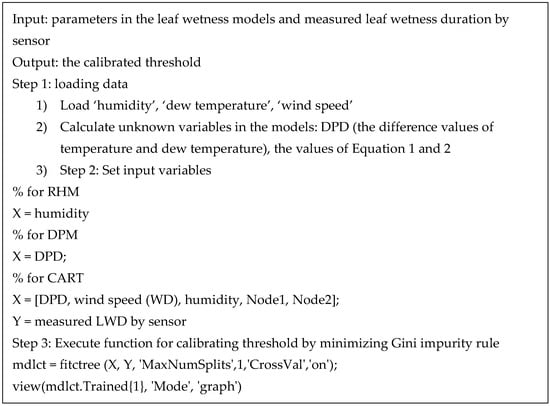A decision learning tree is a commonly used method in data mining and classification [35]. A decision tree algorithm works by splitting a dataset so as to train a model through a recursive partitioning process. Then the model is used to predict the value of a target variable based on the independent variables (Figure 6). In the leaf wetness models, the model parameters are independent variables (X) while leaf wetness is the classification variable (wet = 1, dry = 0). The splitting rule is that a sample goes right if a ‘feature value X ≤ C′, otherwise it goes left. The Gini index is the criterion used to reduce the impurity in classification splitting since it can be computed more rapidly and be readily extended to include symmetrized costs [26]. The Gini index of node impurity in the leaf wetness classification problem can be expressed as in Equation (3). The Gini index reaches a zero value when only one class is present at a node. This means that the Gini index will be zero if all cases at a node belong to the same class, where p(t) denotes the relative frequency of the first class at the node. The process of calibrating the leaf wetness models (RHM, DPM and CART) thresholds by the decision learning tree method using the MATLAB tool is shown in Figure 7.