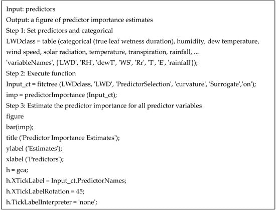 Usually, input parameters are chosen based on expertise and historical data [25]. In this article, by employing the decision tree method it has been possible to use a predictor importance ranking to help select the most effective factors and reduce time lost; the process is shown in Figure 8. The predictor’s importance is computed by totaling the changes in the mean squared error (MSE) caused by the splits for each predictor, and then dividing the total by the number of branch nodes. The variable importance associated with this split is computed as the difference between MSE for the parent node and the total MSE for the two child nodes. In our case, the predictor’s importance had the same rank for the Spanish (Figure 9a) and Chinese greenhouses (Figure 9b). Relative humidity (RH), dew temperature (dewT), transpiration (E) and radiation (Ra) were the first four predictors ranked in importance for LWD.