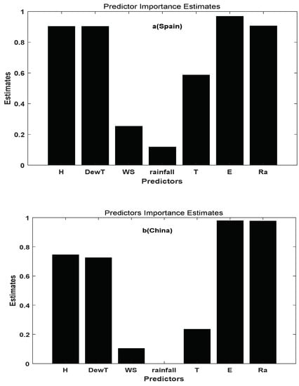 Analyzing sensitivity of the NNM to individual inputs aims to evaluate the feasibility of simplifying the number of NNM inputs (Table 3). When humidity and radiation were the inputs of the NNM, the model had higher accuracy than the model with individual inputs. It was better to use the NNM with the four inputs in our case, because of its highest accuracy of 0.88 for Spain and 0.92 for China. Therefore, the group of four parameters—relative humidity, dew temperature, transpiration and radiation—made up the new NNM input parameters (Figure 10). Transpiration was estimated using a referenced method [18].