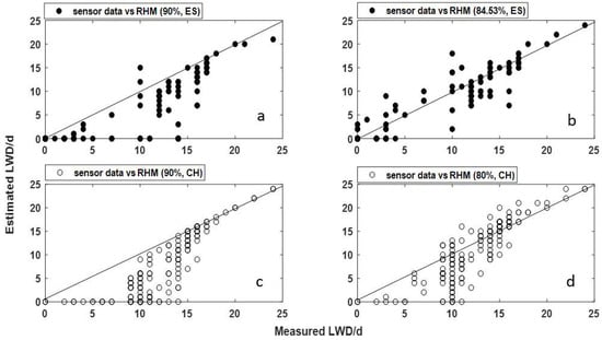 Four scatter plots between estimated and measured LWD using RHM in the two greenhouses are shown in Figure 11. When the empirical threshold (RH > 90%) was used, the data deviated from the 1:1 straight line (Figure 11a,c); on the contrary, the model performance improved when the threshold was calibrated to 84.53% in the ES greenhouse and 80% in the CN greenhouse, with an EF of 0.95 (ES) and 0.97 (CN). In particular, the accuracy of the model greatly improved, with a Sen of 0.53 (ES) and 0.85 (CN), while PPV and NPV also increased, with an Acc of 0.83 (ES) and 0.80 (CN). After calibration, the mean absolute error decreased from 7.12 h to 5.31 h in ES and from 6.12 h to 2.73 h in CN (Table 4).