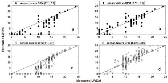 The differences in the performance of the DPM before (DPD < 2 °C) and after calibration (DPD < 2.7 °C for ES and DPD < 5.42 °C for CN) could be explained by the data distribution in the scatter plots (Figure 12) and the performance statistic values in Table 5. The calibrated DPM threshold reduced the estimation of LWD, as proved by data distributions shown in Figure 12b,d, which fitted better to the 1:1 straight line than in Figure 12a,c. Moreover, the PPV increased to 0.67 (ES) and 0.79 (CN), Sen rose to 0.56 (ES) and 0.83 (CN), and Acc reached 0.83 (ES) and 0.80 (CN). The effectiveness of the calibration threshold was also proved by lower MAE and SD than with the DPD threshold fixed at 2 °C (Table 5).