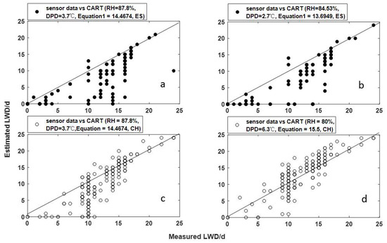 The calibration CART model maintained the four categories, but with different thresholds. The first category is to identify whether the leaf is wet or dry depending on the DPD value. The original threshold (3.7 °C) was modified to 2.7 °C for ES and 6.3 °C for CN. Equation (1) was applied to evaluate leaf wetness occurrence in conditions of low wind speed (wind speed < 2.5 m s−1), whereas Equation (2) was used when RH is high (relative humidity above 87.8%). This work kept these coefficients in Equation (1) unchanged, to limit the calibration of the CART model to the thresholds leading to new node splitting (13.6949 for Spain, 15.5 for China), while adopting the conditions of relative humidity greater than 84.53% for Spain and 80% for China before using Equation (2) to identify leaf class (Figure 13). The model performance showed great improvement, which can be proved by comparing statistic values that were calculated before and after calibration of the model, with an AUC of 0.88 (in ES) and 0.91 (in CN), as well as an Acc of 0.83 (in ES) and 0.82 (in CN). The better performance of the calibrated model also was reflected in lower MAE and SD, which were 4.60 h and 5.92 h for ES, and 2.13 h and 2.84 h for CN, respectively (Table 6).