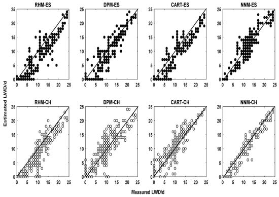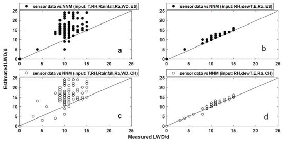 The evaluation data were acquired in Spain from March 2017 to February 2018 and in China from December 2014 to October 2015. These data were used to assess the calibration models’ performance. Comparison results of estimated and measured LWD are shown in Figure 15. Most subfigures in Figure 15 show a good fitting, however, large errors remained, even after calibration (Figure 15, RHM-ES). A multi-model comparison was carried out to rank model performances (Table 8). The NNM was the most efficient at estimating LWD in ES, with a PPV of 0.82 and a NPV of 0.87, while also it has higher accuracy, with 1.85 h (MAE) and 2.25 h (SD). Furthermore, the results of estimation of LWD of the other LWD models were similar, with low ranges of PPV [0.71 0.77], and NPV [0.71 0.76]. For the Chinese greenhouse, the NNM obtained an excellent result of LWD estimation, with a PPV of 0.90, a NPV of 0.92, a MAE of 1.30 h and a SD of 1.62 h.