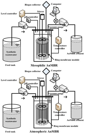 The two same AnMBRs were employed in this study and were operated under mesophilic temperature (35 °C) (M-AnMBR) and atmospheric temperature (25 °C) (A-AnMBR) (see Figure 1). The setup of the AnMBR had been introduced in a previous study []. The AnMBR was consisted of an anaerobic reactor with a working volume of 8 L and a ring membrane module. The AnMBR with a mixer (complete mixing) was fed with synthetic wastewater, and the effluent was collected with a suction mode of 4 min “on” and 1 min “off”. The transmembrane pressure (TMP) was monitored by a manometer, and once the TMP reached 30 kPa in any of the AnMBRs, the membrane modules in the two bioreactors were taken out and cleaned. The modules were reloaded into the bioreactors to run the next HRT after chemical cleaning. The AnMBRs were operated under three different HRTs conditions: 24 h, 12 h, and 6 h.