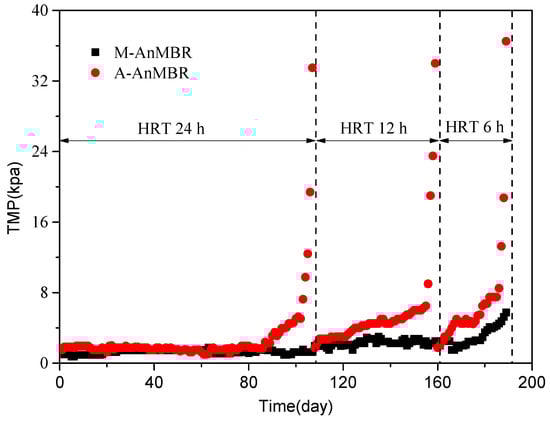 It was seen from Figure 2 that the TMP always maintained lower level in the M-AnMBR and the faster membrane fouling occurred in the A-AnMBR under each HRT. In the A-AnMBR, the time for TMP reaching more than 0.030 MPa was 107 days, 52 days, and 30 days for HRT 24 h, 12 h, and 6 h, respectively. At HRT 24 h, the A-AnMBR was operated with a longer membrane fouling period compared to the other HRTs.