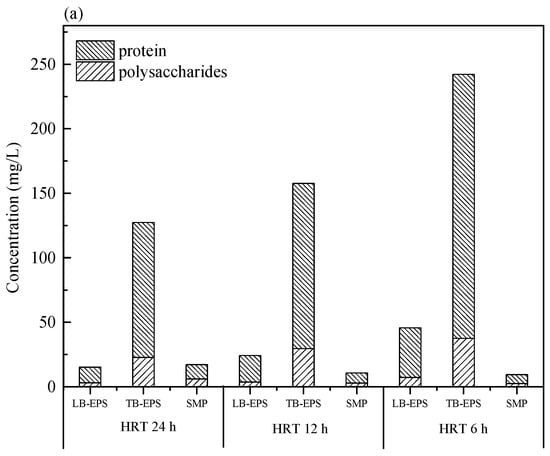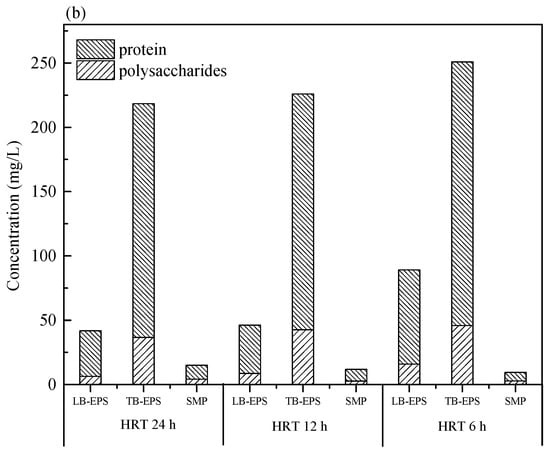 It is widely accepted that membrane fouling in the membrane bioreactor is significantly affected by SMP and EPS []. Sludge cells in the floc matrix have a double layered EPS structure: LB-EPS diffused from TB-EPS surrounding the cells [,]. Carbohydrates and proteins as the major component of SMP, LB-EPS, and TB-EPS were analyzed, as depicted in Figure 3. It was noted that the concentrations of carbohydrates and proteins of LB-EPS and TB-EPS were increased obviously with the decrease of HRT in the two bioreactors, and the values of the M-AnMBR were much lower than that of the A-AnMBR. The different contents of SMP and EPS with the variation of the HRT in the two AnMBRs could be attributed to the variation of the microbial community structure, which plays an important role in the component of microbial metabolites.