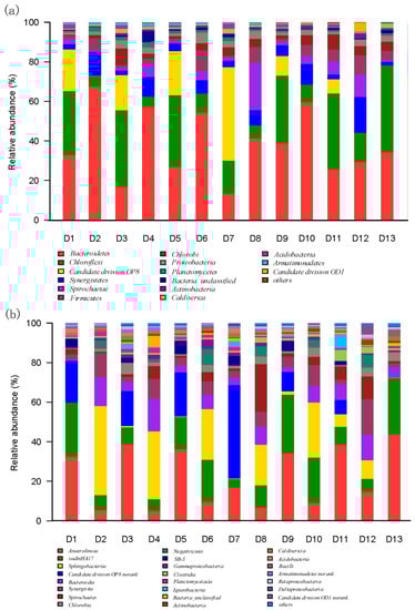 Qualified reads were assigned to known phyla and class levels to characterize the bacterial communities (Figure 4). As seen from Figure 4a, all communities showed extremely high diversity, and 15 phyla were detected in all the sludge samples.